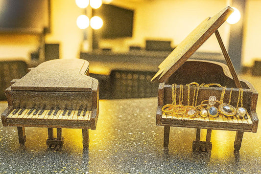 Miniature grand piano jewelry box in matte black MDF with lid, pedals & keys. Heirloom-quality gift handcrafted in Fowlerville, Michigan.